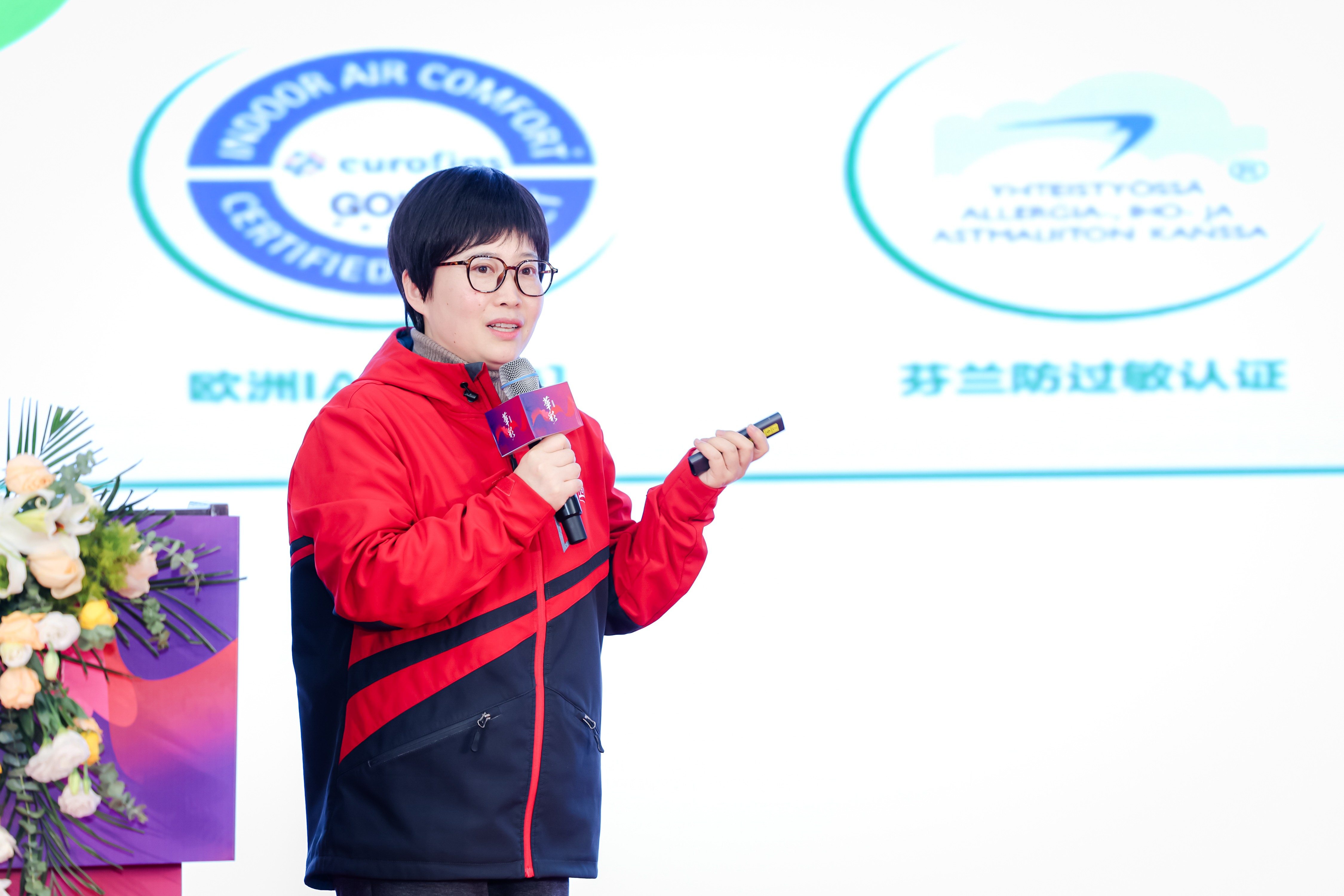 環(huán)保矩陣則由技術部產品認證經理姜利紅重點闡述。她從消費者最關心的健康與安全出發(fā),詳細的介紹了華彩在環(huán)保維度上的整體布局,全線產品在VOC釋放量、氣味等級等關鍵指標上,均按照遠高于一般產品的標準執(zhí)行,并先后通過了世界四大嚴苛環(huán)保認證:歐洲Eurofins室內空氣質量IAC金級認證、芬蘭防過敏認證(本產品與芬蘭過敏、皮膚和哮喘聯(lián)合會合作開發(fā))、美國UL室內空氣質量綠色衛(wèi)士GREENGUARD [金級]認證、芬蘭建筑材料釋放等級認證M1級。